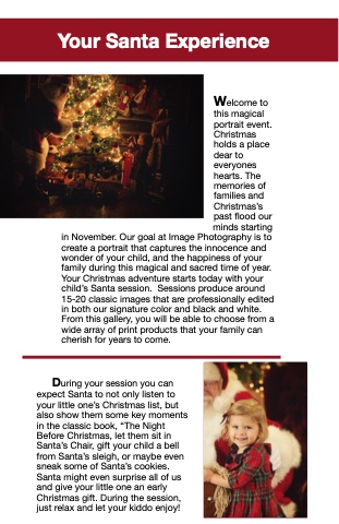 in November. Our goal at Image Photography is to create a portrait that captures the innocence and wonder of your child, and the happiness of your family during this magical and sacred time of year. Your Christmas adventure starts today with your child’s Santa session. Sessions produce around 15-20 classic images that are professionally edited in both our signature color and black and white. From this gallery, you will be able to choose from a wide array of print products that your family can cherish for years to come.