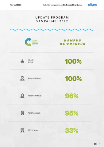 Edisi Mei 2022 Satu Hati Menggemakan #IndonesiaCintaQuran UPD ATE PR OGR A M SA MPAI MEI 2022 K AM PUS D AI PREN EUR Masjid 100% Al Fatih 100% Asrama Ikhwan 96% Asrama Akhwat 95% Asrama Dosen 33% Office Tower 23 •