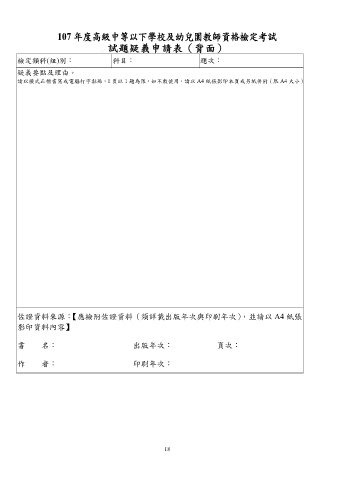 107 年度高級中等以下學校及幼兒園教師資格檢定考試 試題疑義申請表(背面) 檢定類科(組)別: 科目: 題次: 疑義要點及理由。 請以橫式正楷書寫或電腦打字黏貼,1 頁以 1 題為限,如不敷使用,請以 A4 紙張影印本頁或另紙併附(限 A4 大小) 佐證資料來源:【應檢附佐證資料(須詳載出版年次與印刷年次),並請以 A4 紙張 影印資料內容】 書 名: 出版年次: 頁次: 作 者: 印刷年次: 18