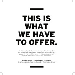 THIS IS WHAT WE HAVE TO OFFER. We offer great products; products to be proud of. Products that help real people do real business. Products that redefine how work is done. We offer our fellow workers a choice, a choice to work differently, a choice that enables them to accelerate. We offer people a choice to work differently. We offer people a choice that enables them to accelerate.