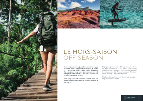 Nous proposons des séjours hors saison. Le voyage est moins cher. Il y a plus de places dans les hôtels. Le personnel est moins stressé et plus disponible. Il y a toujours moyen de faire des activités à la date que le client veut. Ce n’est jamais la saison des grosses pluies ou de cyclone.
