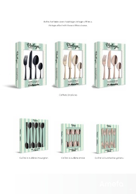 Boîtes fantaisie avec habillage vintage « fifties ». Vintage effect with these « fifties » boxes. Coffrets 24 pièces Coffret 6 cuillères mazagran Coffret 6 cuillères moka Coffret 6 fourchettes gâteau 19