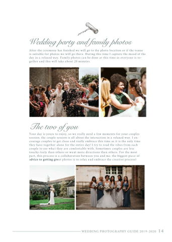 Aftertheceremonyhasfinishedwewilgotothephotolocationorifthevenue issuitableforphotoswewilgothere.DuringthistimeIcapturethemoodofthe dayinarelaxedway.Familyphotoscanbedoneatthistimeaseveryoneisto- getherandthiswiltakeabout20minutes.