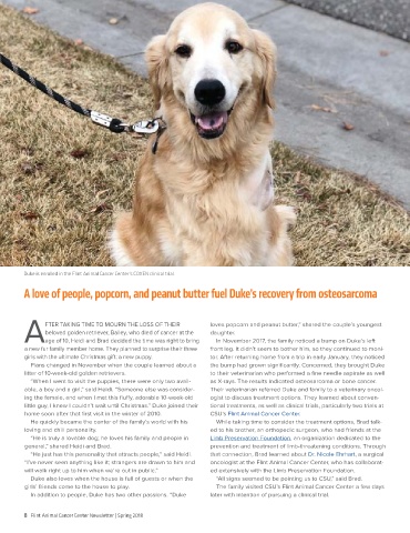 able, a boy and a girl,” said Heidi. “Someone else was consider-  Their veterinarian referred Duke and family to a veterinary oncol-  Ultimately, Duke’s family decided to   osteosarcoma and provide a longer and   reports.