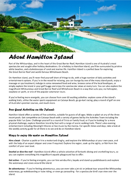 white beaches, and a kaleidoscope of coral and marine life. Hamilton Island is a perfect base for exploring