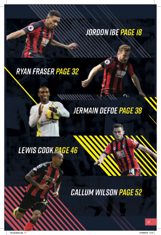 Jordon Ibe Page 18 Ryan Fraser Page 32 Jermain defoe Page 38 Lewis cook Page 46 Callum Wilson Page 52 * Annual Main.indd 17 07/09/2018 10:12 17