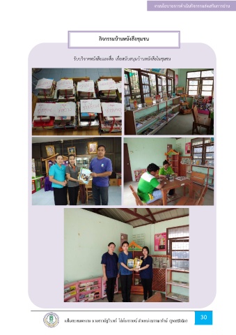 งานนโยบายการด าเนินกิจกรรมส่งเสริมการอ่าน กิจกรรมบ้านหนังสือชุมชน รับบริจาคหนังสือและสื่อ เพื่อสนับสนุนบ้านหนังสือในชุมชน 30 แฟ้มสะสมผลงาน นางสาวนัฐรินทร์ โล่ห์นารายณ์ ต าแหน่งบรรณารักษ์ (portfolio)