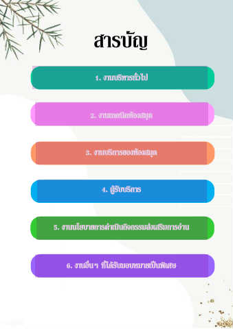 สารบัญ 1. งานบริหารทั่วไป 2. งานเทคนิคห้องสมุด 3. งานบริการของห้องสมุด 4. ผู้รับบริการ 5. งานนโยบายการด าเนินกิจกรรมส่งเสริมการอ่าน 6. งานอื่นๆ ที่ได้รับมอบหมายเป็นพิเศษ 4 แฟ้มสะสมผลงาน นางสาวนัฐรินทร์ โล่ห์นารายณ์ ต าแหน่งบรรณารักษ์ (portfolio)