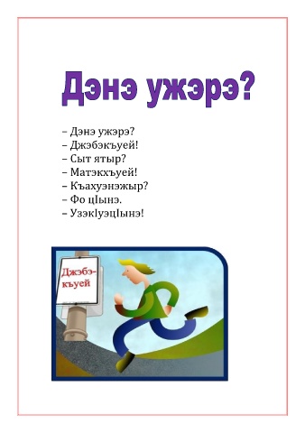 – Дэнэ ужэрэ? – Джэбэкъуей! – Сыт ятыр? – Матэкхъуей! – Къахуэнэжыр? – Фо цIынэ. – УзэкIуэцIынэ!