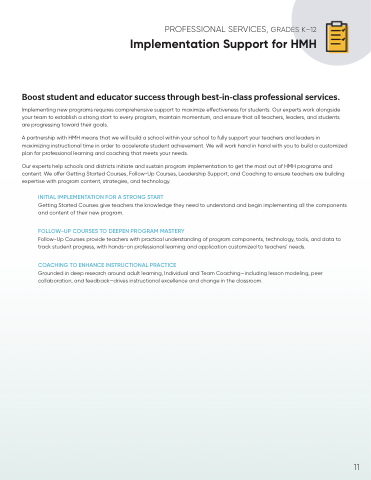 Our experts help schools and districts initiate and sustain program implementation to get the most out of HMH programs and content. We o er Getting Started Courses, Follow-Up Courses, Leadership Support, and Coaching to ensure teachers are building