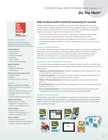 Do The Math is organized into 13 sca olded modules that can be used for core instruction in numerical reasoning, pull-out intervention, or extended day settings. Each module includes a series of thirty 30-minute lessons. The modular design gives the program the exibility to span multiple grade levels.