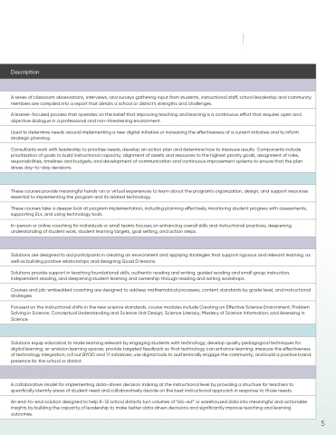 A series of classroom observations, interviews, and surveys gathering input from students, instructional sta , school leadership and community members are compiled into a report that details a school or district’s strengths and challenges.