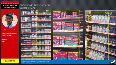 IN-STORE VISIBILITY (SECONDARY FOC DISPLAYS) IMPROVEMENTS Carrefour RAK2 At your service! Merchandiser Name: MIDLAJ SUBAIR Region: RAK CARREFOUR Promotion period ended 22 September, 2019 nd *Extended display, for liquidation purposes only