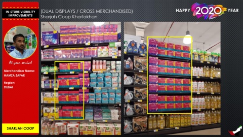 IN-STORE VISIBILITY (DUAL DISPLAYS / CROSS MERCHANDISED) HAPPY YEAR IMPROVEMENTS Sharjah Coop Khorfakhan At your service! Merchandiser Name: HAMZA ZAFAR Region: DUBAI SHARJAH COOP