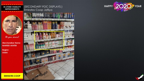 IN-STORE VISIBILITY (SECONDARY FOC DISPLAYS ) HAPPY YEAR IMPROVEMENTS Emirates Coop Jafliya At your service! Merchandiser Name: NAWEED AKHTER Region: DUBAI EMIRATES COOP