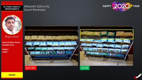 IN-STORE VISIBILITY (PRIMARY DISPLAYS) HAPPY YEAR IMPROVEMENTS Geant Remraam At your service! Merchandiser Name: MAHESH NAIK Region: DUBAI BEFORE AFTER GEANT
