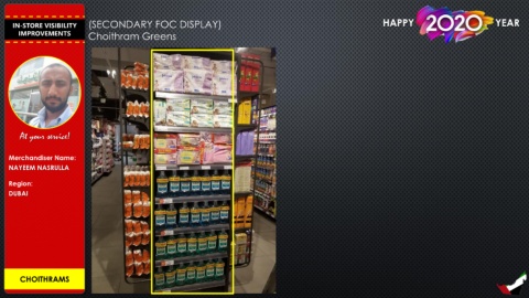 IN-STORE VISIBILITY (SECONDARY FOC DISPLAY) HAPPY YEAR IMPROVEMENTS Choithram Greens At your service! Merchandiser Name: NAYEEM NASRULLA Region: DUBAI CHOITHRAMS