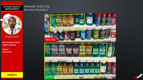 IN-STORE VISIBILITY (PRIMARY DISPLAYS) IMPROVEMENTS Spinneys Khalidiya At your service! BEFORE Merchandiser Name: AQEEL SIDDIQUI Region: ABU DHABI SPINNEYS AFTER