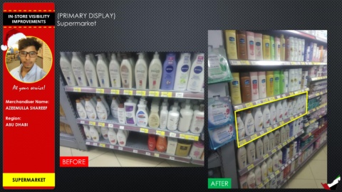 IN-STORE VISIBILITY (PRIMARY DISPLAY) IMPROVEMENTS Supermarket At your service! Merchandiser Name: AZEEMULLA SHAREEF Region: ABU DHABI BEFORE SUPERMARKET AFTER