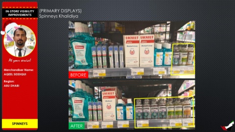 IN-STORE VISIBILITY (PRIMARY DISPLAYS) IMPROVEMENTS Spinneys Khalidiya At your service! Merchandiser Name: AQEEL SIDDIQUI BEFORE Region: ABU DHABI SPINNEYS AFTER