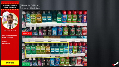 IN-STORE VISIBILITY (PRIMARY DISPLAY) IMPROVEMENTS Spinneys Khalidiya At your service! BEFORE Merchandiser Name: AQEEL SIDDIQUI Region: ABU DHABI SPINNEYS AFTER