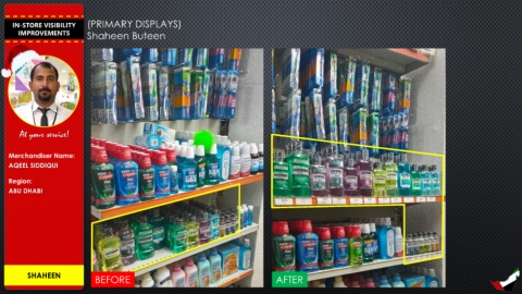 IN-STORE VISIBILITY (PRIMARY DISPLAYS) IMPROVEMENTS Shaheen Buteen At your service! Merchandiser Name: AQEEL SIDDIQUI Region: ABU DHABI SHAHEEN BEFORE AFTER