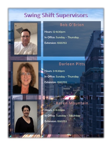 Hours: 12-8:30pm In Office: Sunday - Thursday Extension: 1065753 Hours: 3-11:30pm In Office: Sunday - Thursday Extension: 1065702 Hours: 3-11:30pm In Office: Tuesday - Saturday Extension: 1065753