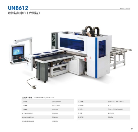 UNB612 青滨永强·值得信赖 数控钻铣中心(六面钻) 主要技术参数 Main technical parameter 工件长度 200-2500MM 刀具数量 垂直12 个+水平2 组4个 工件宽度 50-1200MM 钻夹规格 Φ10 工件厚度 10-60MM 外形尺寸 5020×2530×2080MM 抓手最大移动速度 80M/MIN 总功率 15.63KW Y 轴最大的移动速度 75M/MIN 工作气压 0.6MPa Z 轴最大的移动速度 30M/MIN 27