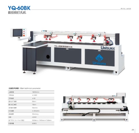 YQ-60BK 青滨永强·值得信赖 数控侧打孔机 主要技术参数 Main technical parameter 主轴转速 18000r/min 工件长度 ≤ 2480 工件宽度 ≥ 80 最大加工厚度 60mm 最小加工厚度 10mm 找孔最大速度 50m/min 打孔速度 ≥ 30m/min 进给速度 30m/ming 功率 4.5KW 加工尺寸(X×Y×Z 行程) 3500mm×1900mm×1300mm 机器净重 890KG 29