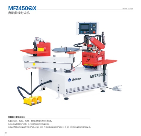 MFZ450QX 青滨永强·值得信赖 自动曲线封边机 机器的主要组成部分 机器由封边机、修边机、托带盘、真空吸盘转臂机构和机体组成。 机体内设有电器箱和气动箱,电气操控箱安装在托带盘立柱上。 在修边机后面的机体上设有气源进气用 AW20-02C-A 型过滤减压阀和排气用的 VHS-20-02A 型残压手动释放阀组合体。 32