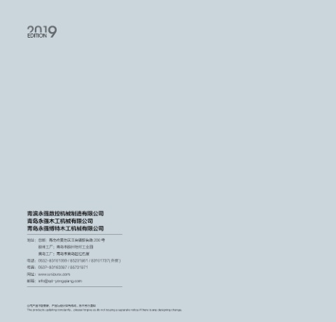 EDITION 青滨永强数控机械制造有限公司 青岛永强木工机械有限公司 青岛永强博特木工机械有限公司 地址:总部:青岛市黄岛区王台镇振台路 200 号 胶州工厂:青岛市胶州社村工业园 黄岛工厂:青岛市黄岛区红石崖 电话:0532-83161059 / 85231861 / 83161737( 外贸 ) 传真:0532-83163087 / 85231871 网址:www.unisunx.com 邮箱:info@qd-yongqiang.com