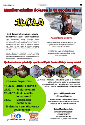 3.12.2025 n:o 12 virtaaajassa.fi 9 Ilolassa tapahtuu 16.-17.12. JOULULOUNAAT 21.12. Jouluruokatori 23.-26.12. Joulu maalla- lomapaketti 31.12. Mökömajan nuotiohetki Muistathan ennakkovarata Joululounaat !
