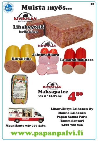 Muista myös... 12 Lihahyytelö isolihainen Jahtimakkara Kultaleike Lauantaimakkara Maksapatee 50 350 g / 12,85 kg 4 Lihanvälitys Laihonen Oy Mauno Laihonen Papan Sauna Palvi Tammelantori Myyntiauto 040 757 4262 0400 722 842 www.papanpalvi.fi