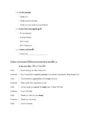 Clerk : Let me weigh your parcel. It weighs 2 gm. It takes 100 baht.