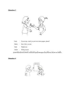 Situation 3 Suda : Excuse me, could you pass me some pepper, please? Malee : Sure. Here you are. Suda : Thank you. Malee : With pleasure. สุดาขอให้มาลีส่งพริกไทยให้ มาลีก็ส่งให้ สุดาจึงขอบคุณ แล้วมาลีก็ตอบว่าด้วยความ ยินดียิ่ง Situation 4