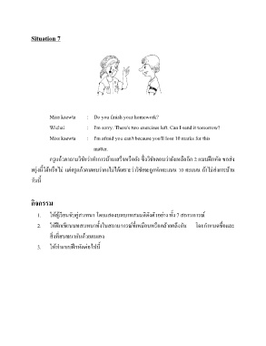1. ให้ผู้เรียนจับคู่สนทนา โดยแสดงบทบาทสมมติดังตัวอย่าง ทั้ง 7 สถานการณ์