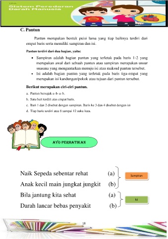 c. Bari 1 dan 2 disebut dengan sampiran. Baris ke 3 dan 4 disebut dengan isi