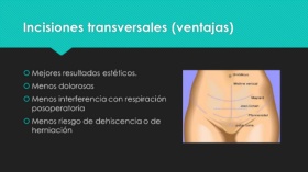 Incisiones transversales (ventajas) Mejores resultados estéticos. Menos dolorosas Menos interferencia con respiración posoperatoria Menos riesgo de dehiscencia o de herniación
