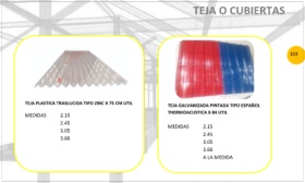 TEJA O CUBIERTAS 103 TEJA PLASTICA TRASLUCIDA TIPO ZINC X 75 CM UTIL TEJA GALVANIZADA PINTADA TIPO ESPAÑOL MEDIDAS 2.15 THERMOACUSTICA X 84 UTIL 2.45 MEDIDAS 2.15 3.05 2.45 3.66 3.05 3.66 A LA MEDIDA 103