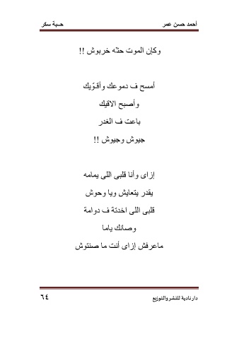ﺮﻜﺳ ﺔﺒــﺣ ﺮﻤﻋ ﻦ ﺴﺣ ﺪﻤﺣأ !! شﻮﺑﺮﺧ ﮫﺘﺣ تﻮﻤﻟا نﺈﻛو ّ ﻚﯾ ّﻮـﻗأو ﻚﻋﻮﻣد ف ﺢﺴﻣأ ﻚﯿﻗﻻا ﺢﺒﺻأو رﺪﻐﻟا ف ﺖﻋﺎﺑ !! شﻮﯿﺟو شﻮﯿﺟ ﮫﻣﺎﻤﯾ ﻰﻠﻟا ﻰﺒﻠﻗ ﺎﻧأو ىازإ شﻮﺣو ﺎﯾو ﺶﯾﺎﻌﺘﯾ رﺪﻘﯾ ﺔﻣاود ف ﺔﺗﺪﺧا ﻰﻠﻟا ﻰﺒﻠﻗ ﺎﻣﺎﯾ ﻚﻧﺎﺻو شﻮﺘﻨﺻ ﺎﻣ ﺖﻧأ ىازإ ﺶﻓﺮﻋﺎﻣ ٦٤ ﻊ زﻮﺘﻟاو ﺮﺸ ﻠﻟ ﺔﻳدﺎﻧ راد