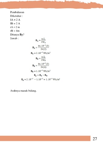 Pembahasan Diketahui : IA = 2 A IB = 2 A rA = 2 m rB = 4m Ditanya Bp? Jawab : Arahnya masuk bidang. 27