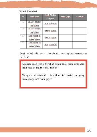 Tabel Simulasi Dari tabel di atas, jawablah pertanyaan-pertanyaan berikut! Apakah arah gaya berubah-ubah jika arah arus dan arah medan magnetnya diubah? Mengapa demikian? Sebutkan faktor-faktor yang mempengaruhi arah gaya? 56