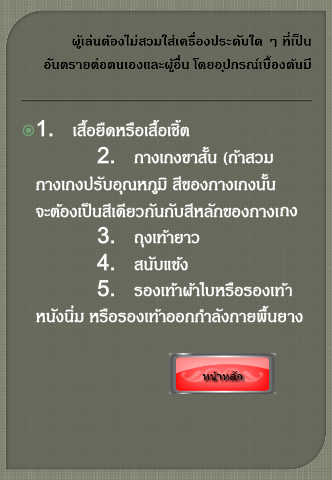 1. เสื้อยืดหรือเสื้อเชิ้ต 2. กางเกงขาสั้น (ถ้าสวม กางเกงปรับอุณหภูมิ สีของกางเกงนั้น จะต้องเป็นสีเดียวกันกับสีหลักของกางเกง 3. ถุงเท้ายาว 4. สนับแข้ง 5. รองเท้าผ้าใบหรือรองเท้า หนังนิ่ม หรือรองเท้าออกก าลังกายพื้นยาง
