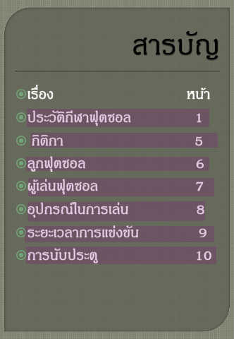เรื่อง หน้า ประวัติกีฬาฟุตซอล 1 กิติกา 5 ลูกฟุตซอล 6 ผู้เล่นฟุตซอล 7 อุปกรณ์ในการเล่น 8 ระยะเวลาการแข่งขัน 9 การนับประตู 10