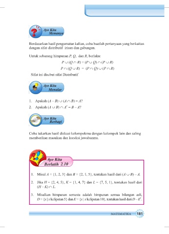 1. Misal A = {1, 2, 3} dan B = {2, 1, 5}, tentukan hasil dari (A ∪ B) – A.