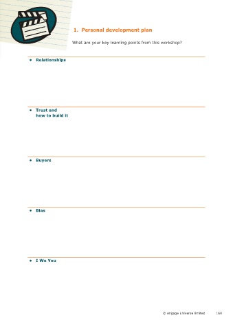 18 1. Personal development plan What are your key learning points from this workshop? • Relationships • Trust and how to build it • Buyers • Bias • I We You © engage universe limited 160