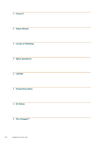 • Focus-5 • Value Sheets • Levels of Thinking • Spicy Questions • LISTEN • Presenting Ideas • CC Notes • The Octagon™ 161 engage-universe.com