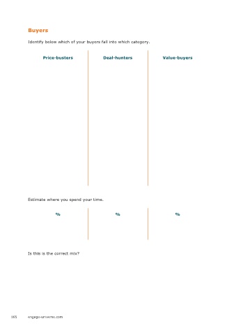 Buyers Identify below which of your buyers fall into which category. Price-busters Deal-hunters Value-buyers Estimate where you spend your time. % % % Is this is the correct mix? 165 engage-universe.com