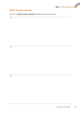 18 action planning Need–Feature–Benefit Write three Need–Feature–Benefit statements that you might use. 1 2 3 © engage universe limited 168