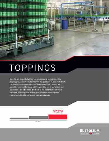 Rust-Oleum Heavy Duty Floor toppings provide protection in the most aggressive industrial environments. Designed to be a permanent solution to flooring problems, our Heavy Duty Floor topping are available in several formulas with varying degrees of protection and application characteristics. Resistant to the most severe chemical exposure, including 98% sulfuric acid, they can also withstand steel-wheeled traffic and severe mechanical abuse.